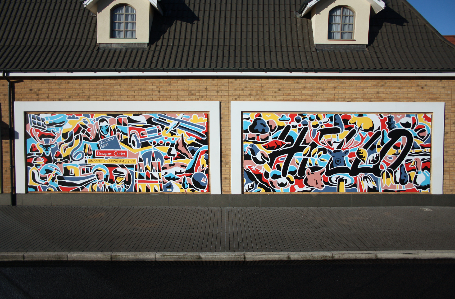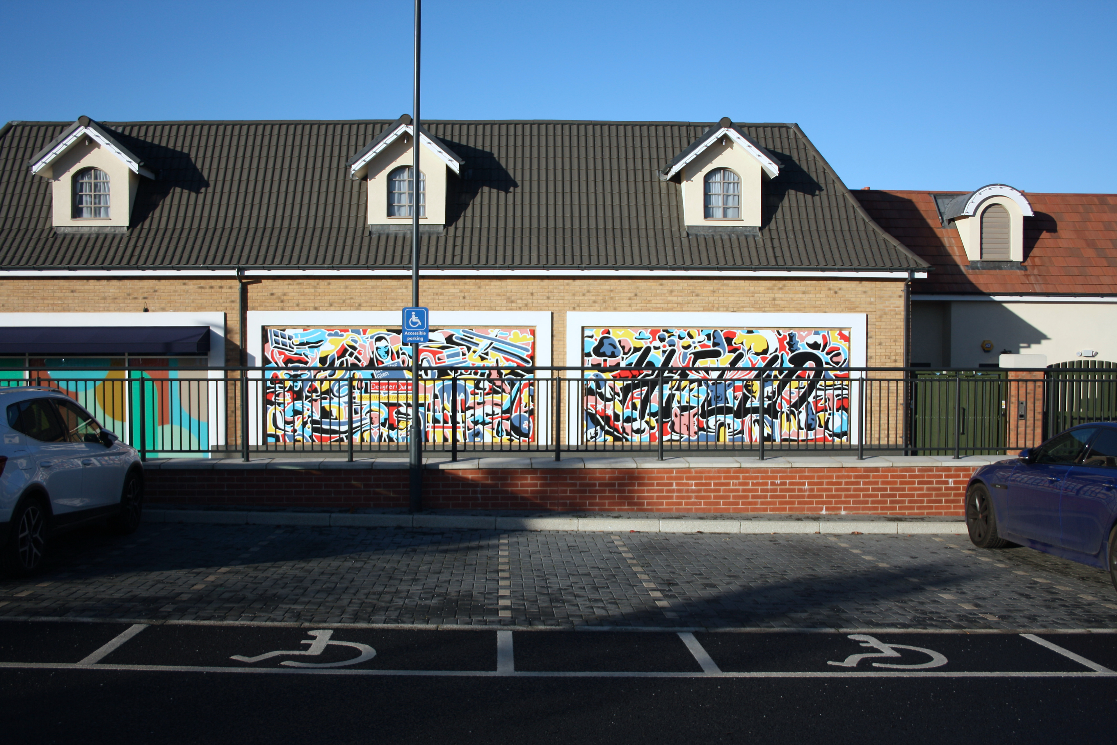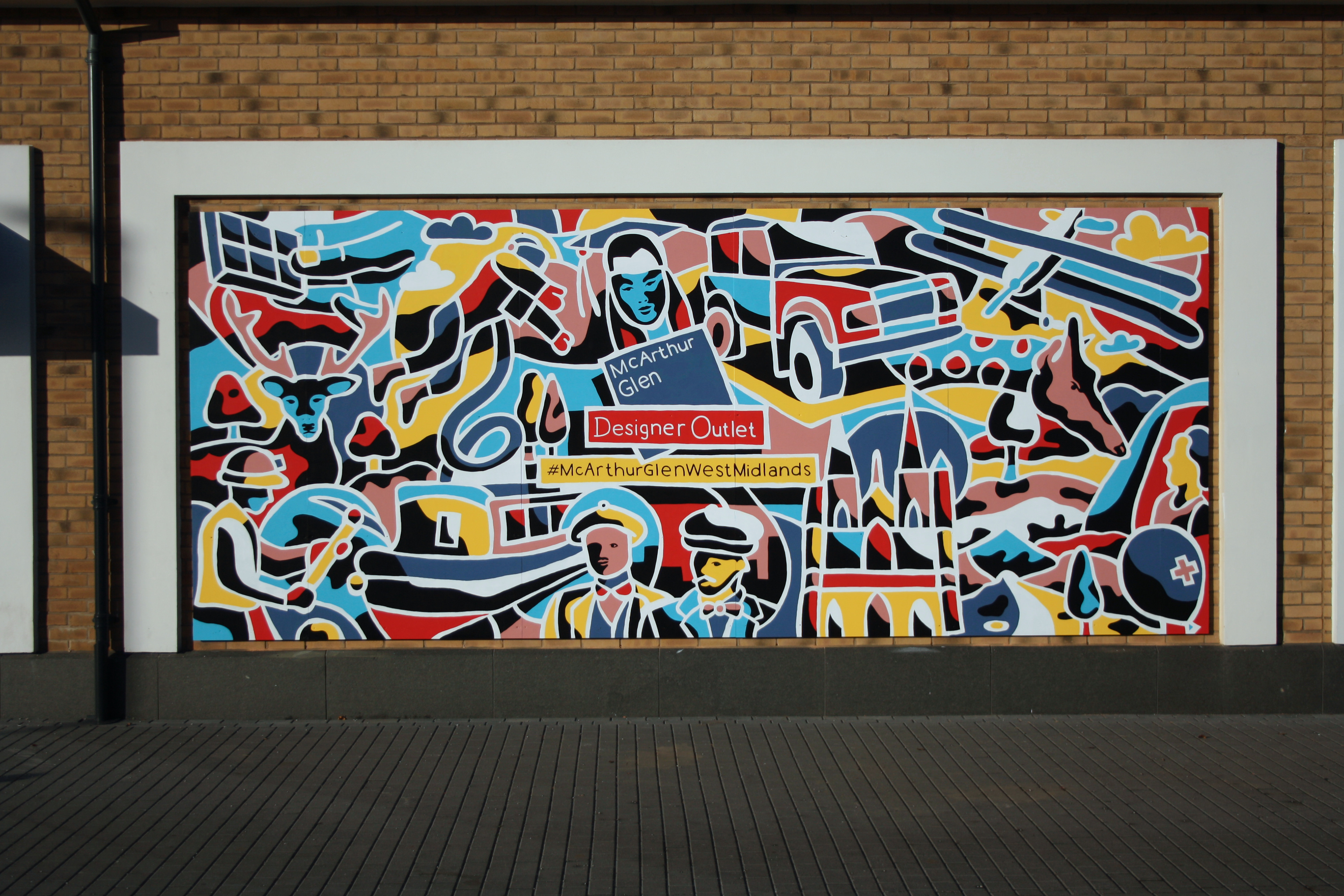 Commissioned by Halpern PR, we worked together to develop the artwork that would be hand-painted at the McArthurGlen Designer Outlet in Cannock. The first mural highlights local landmarks from the towns and cities surrounding the centre. The second mural celebrates the wildlife and nature of Cannock Chase.