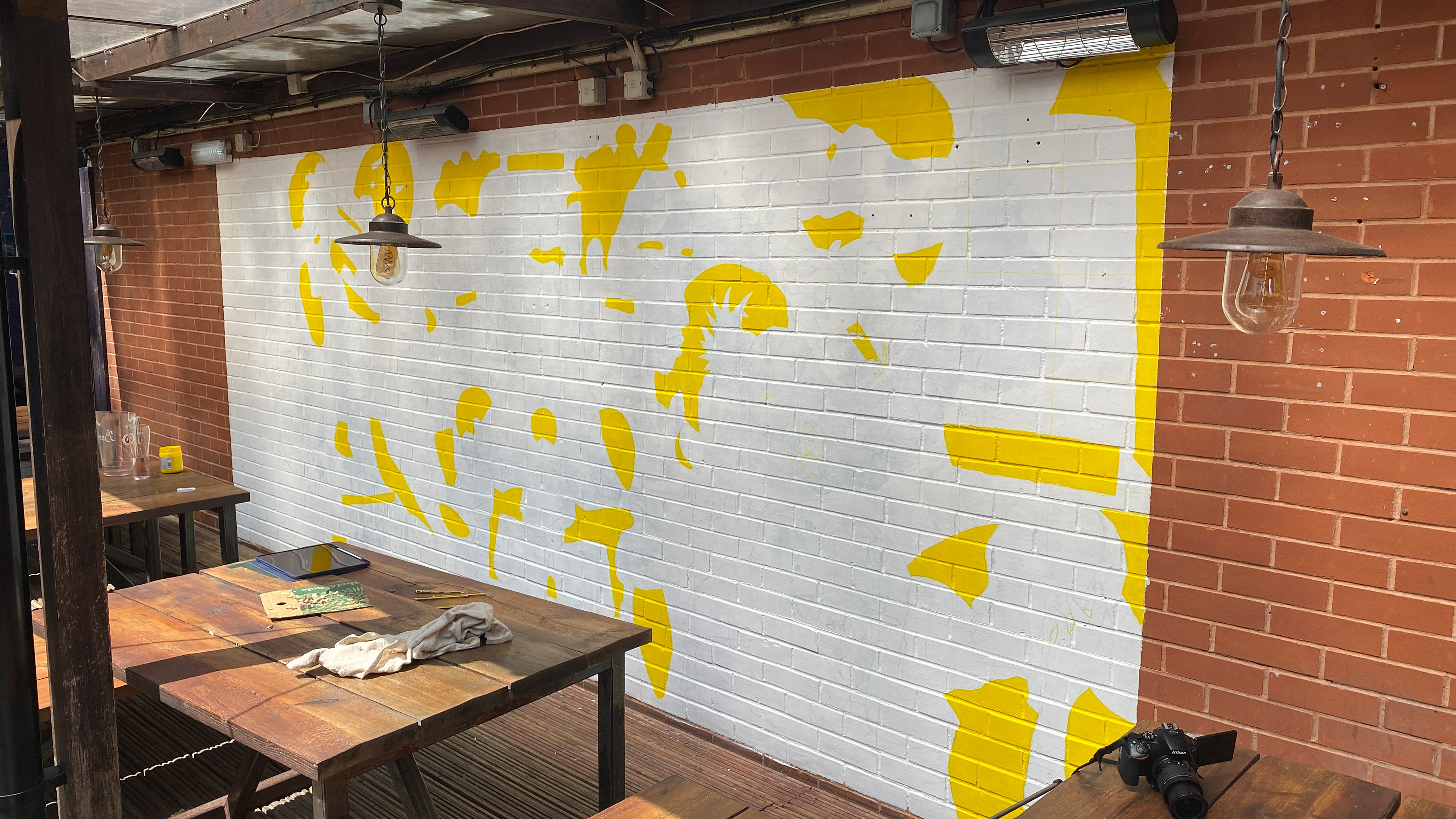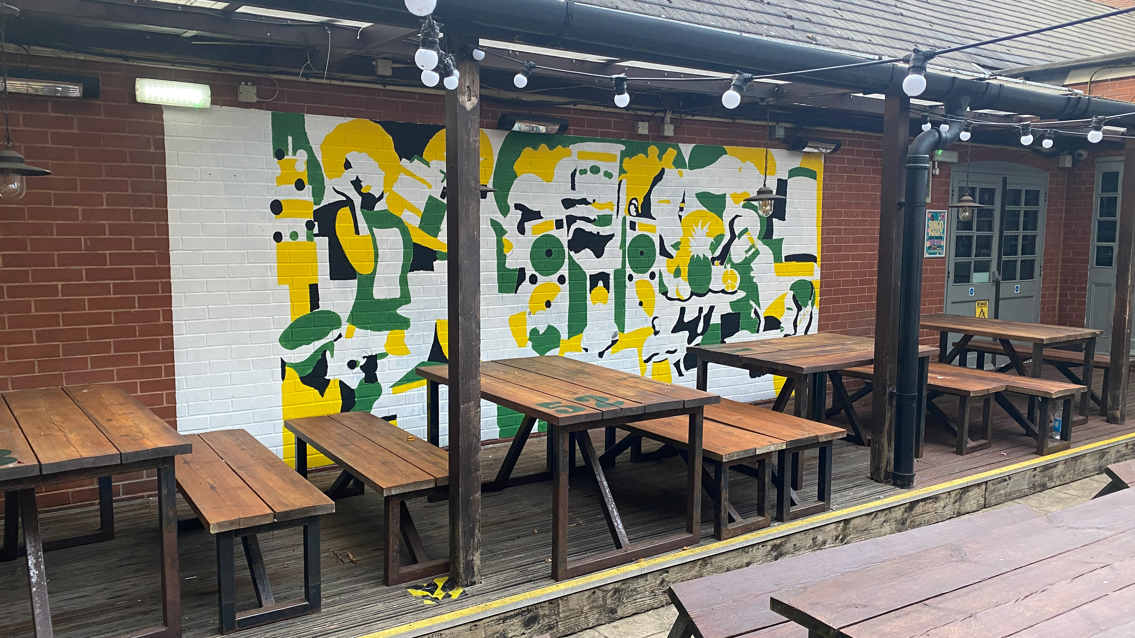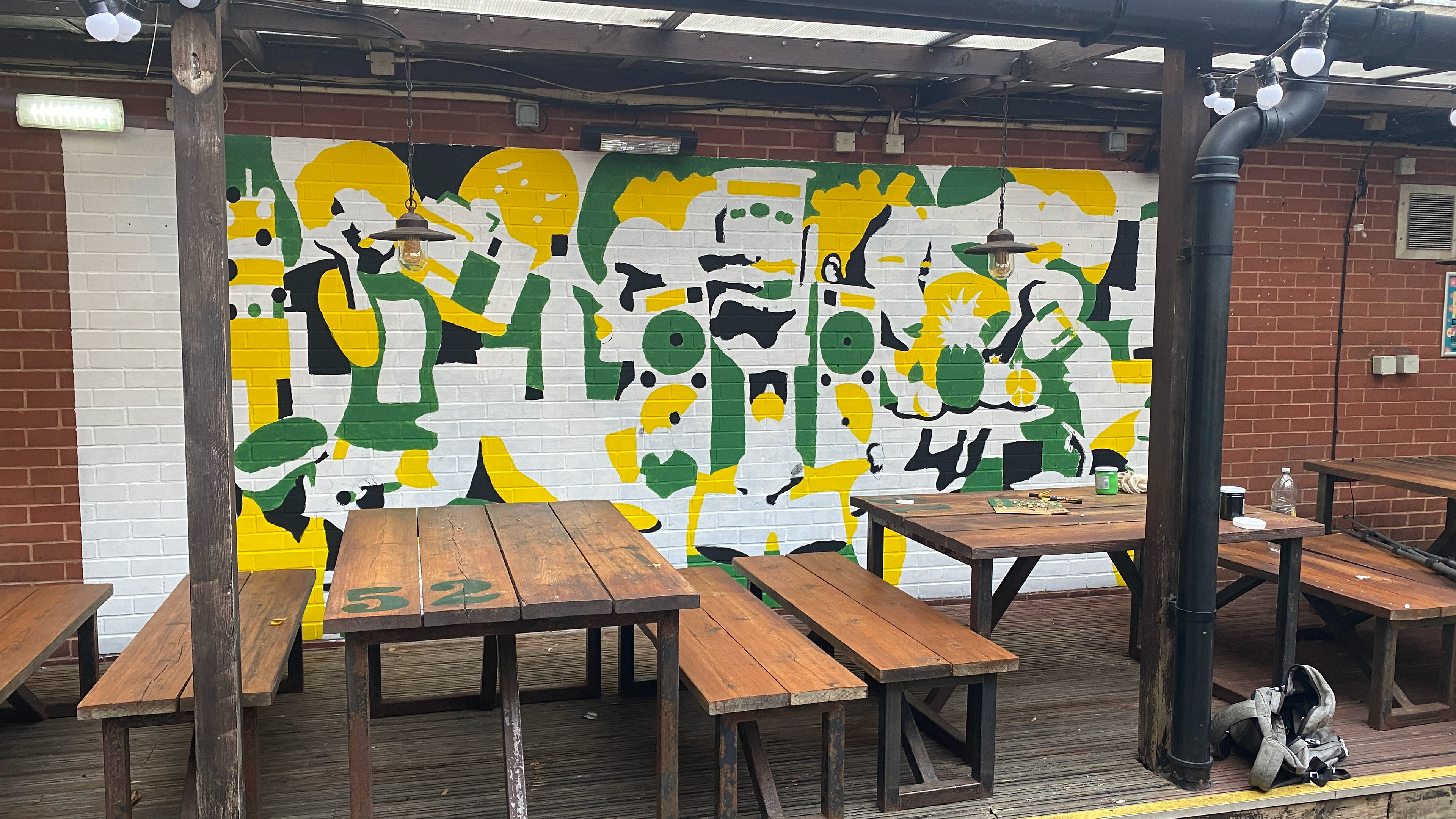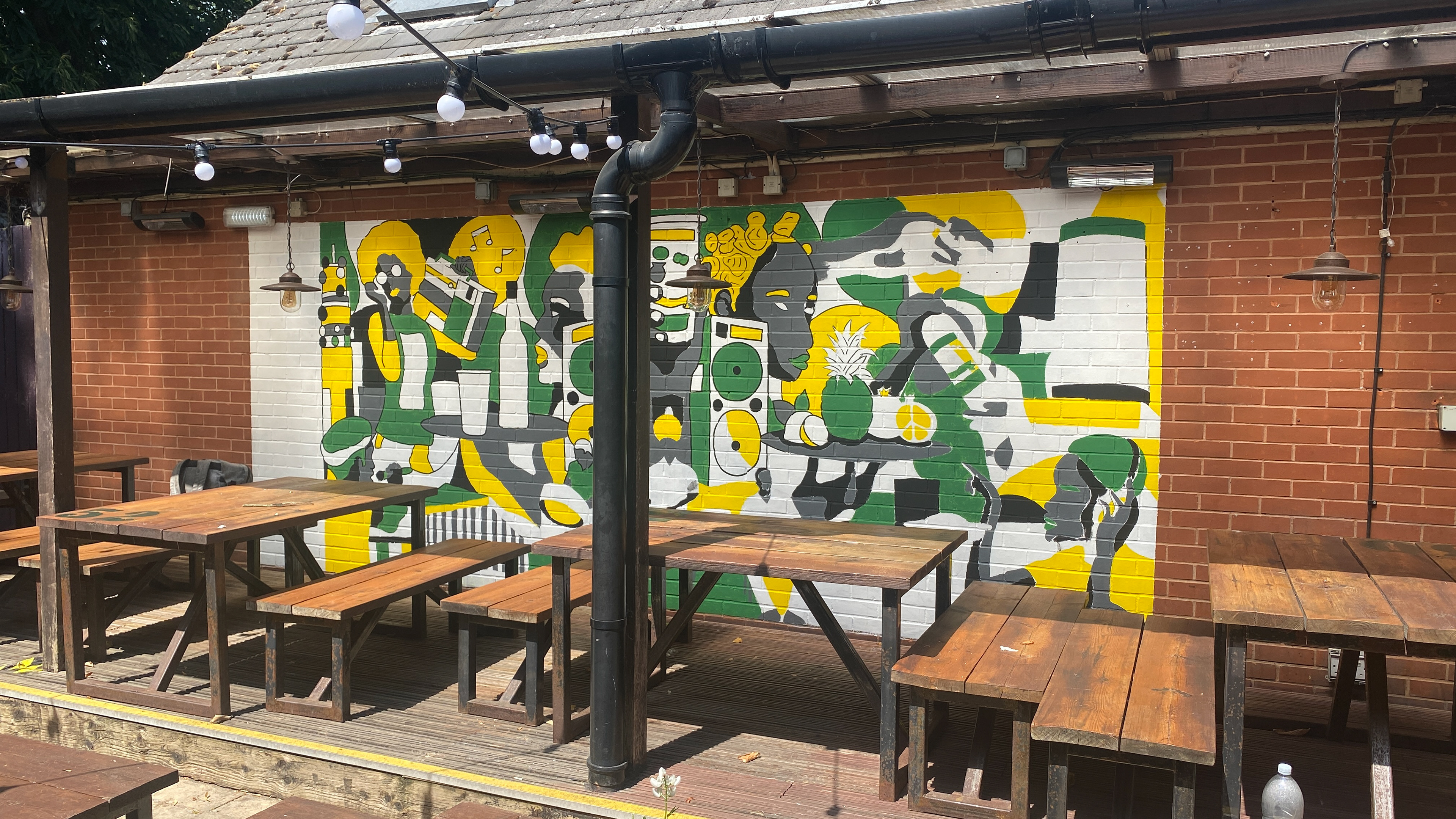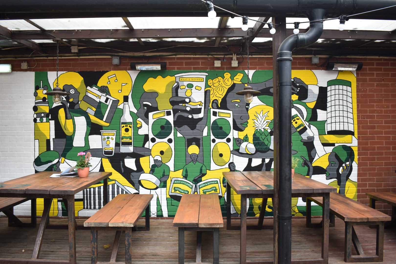 I was commissioned by Warm Street to design and paint a Wray & Nephew Mural at the One Trick Pony Club bar in Moseley, Birmingham. The mural contains a fusion of Birmingham's Jamaican population, music and Wray & Nephew's key products..